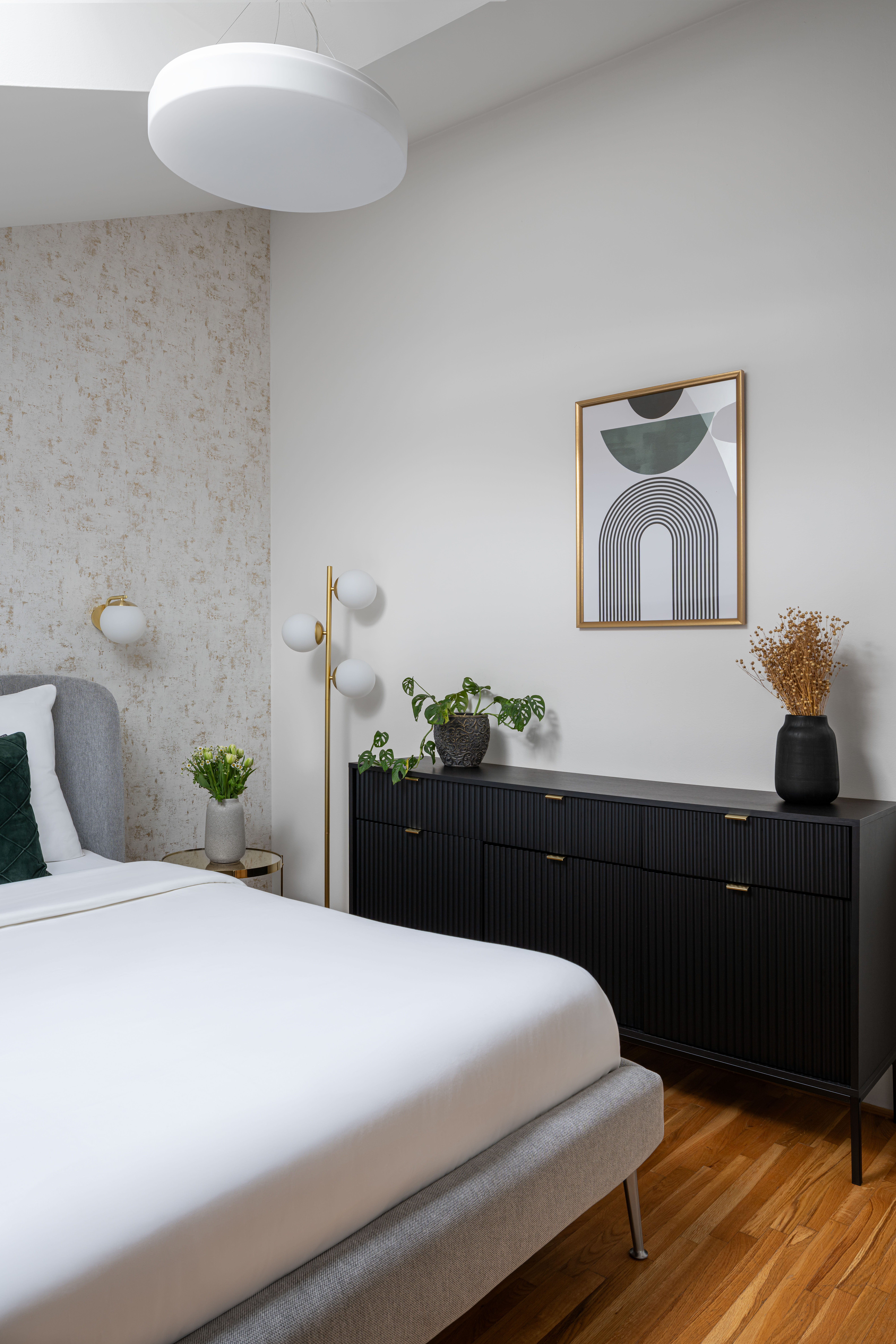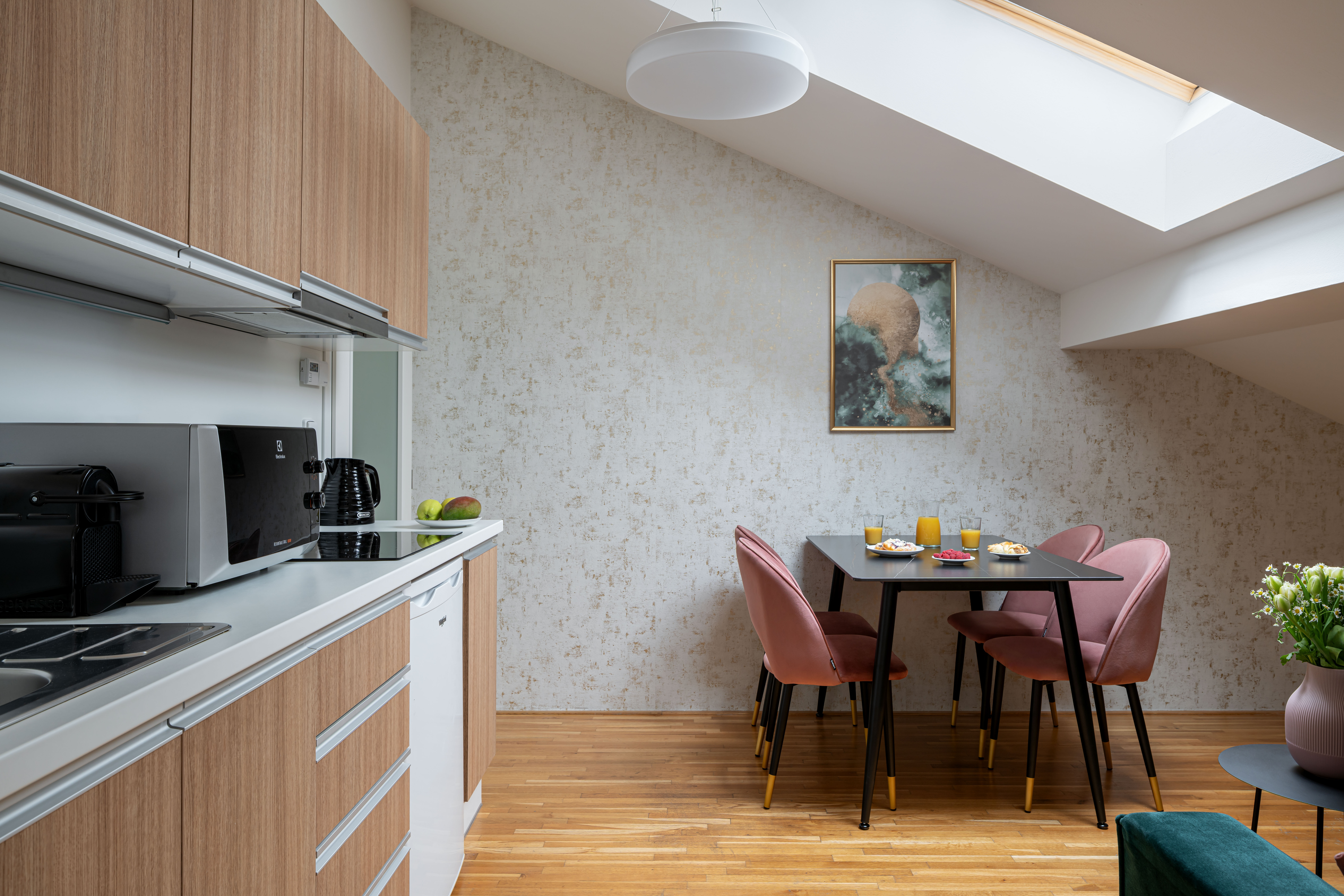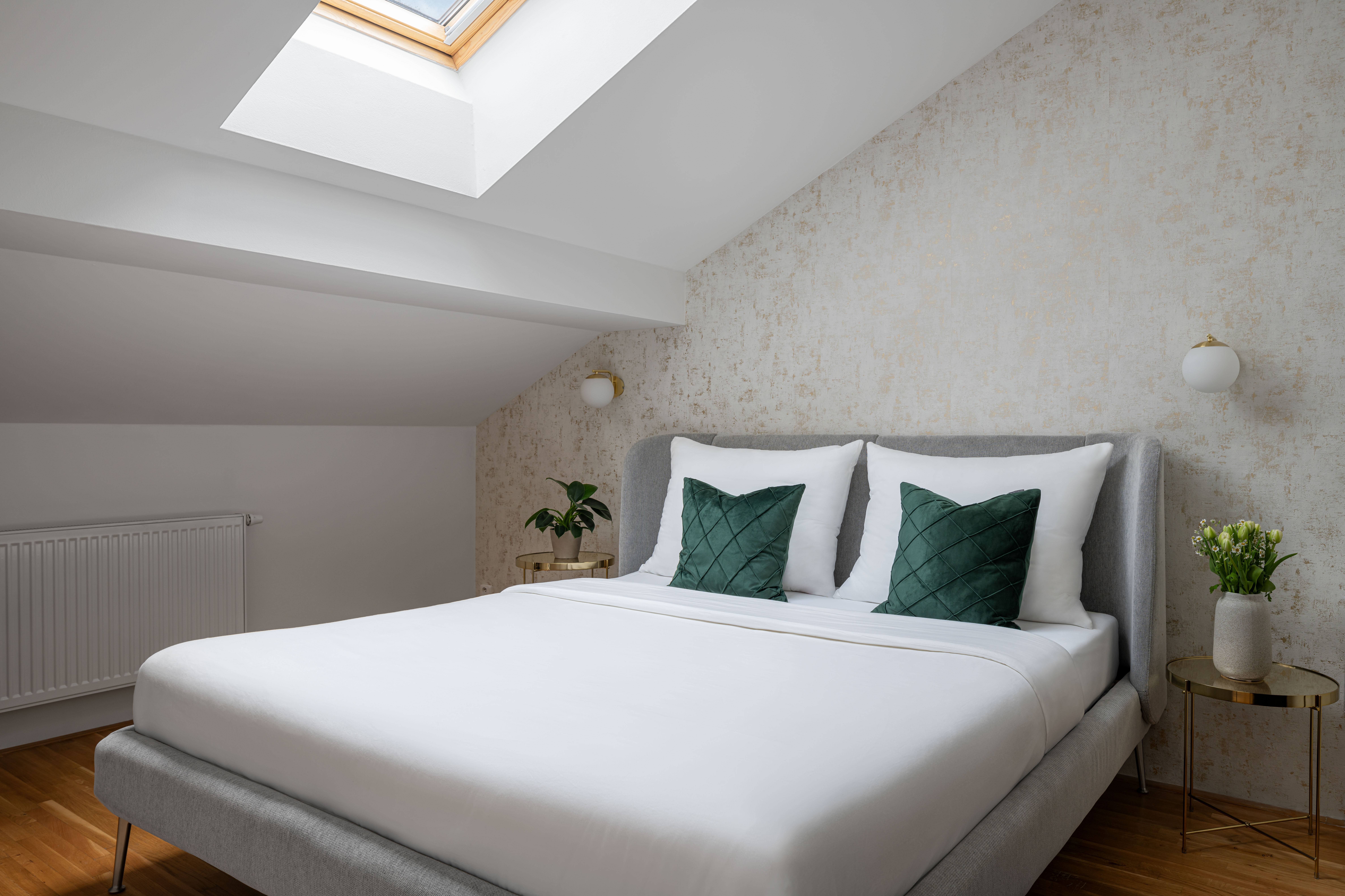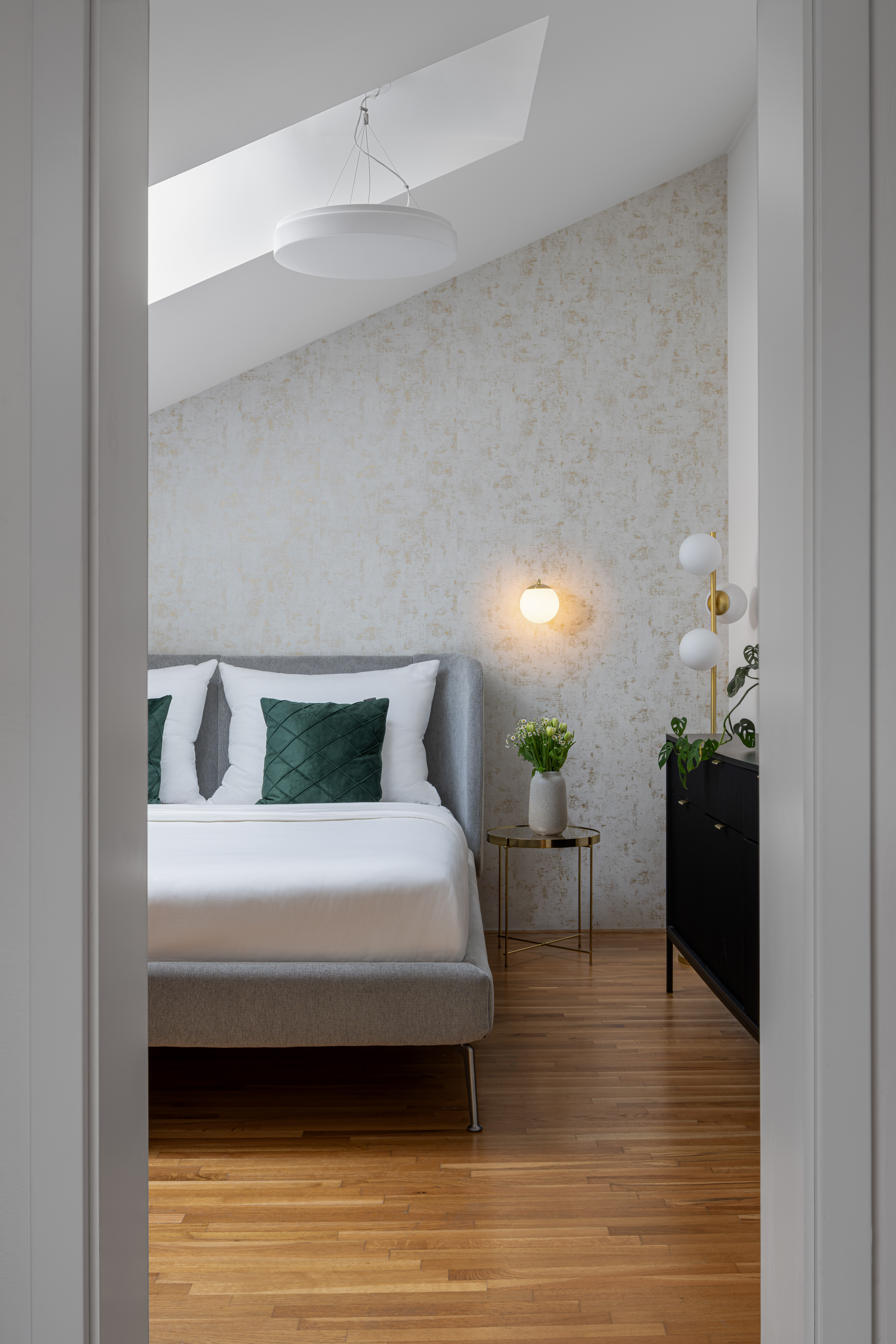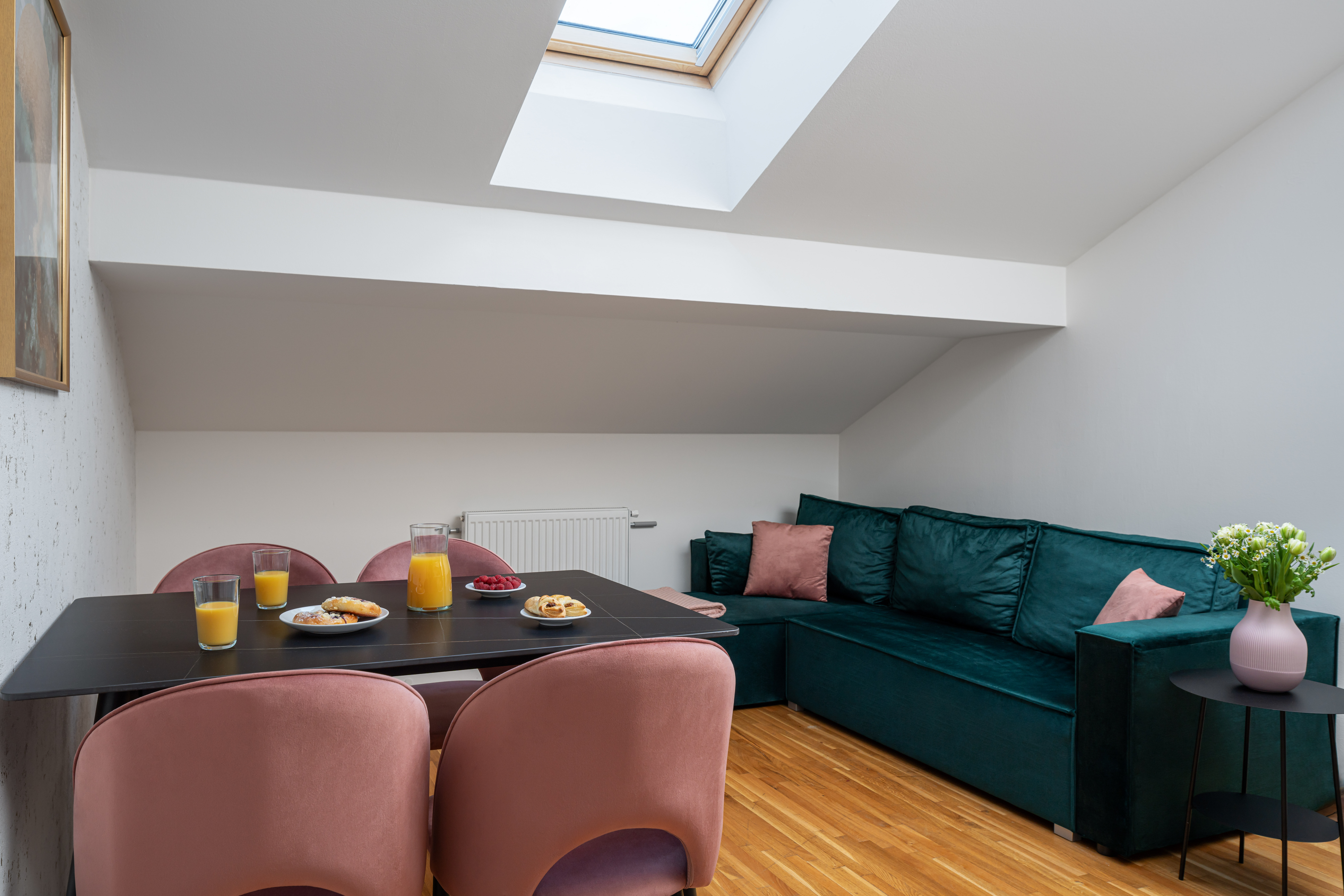 The apartment is bright and airy, filled with natural daylight thanks to the skylight windows, which enhance its modern and elegant atmosphere.