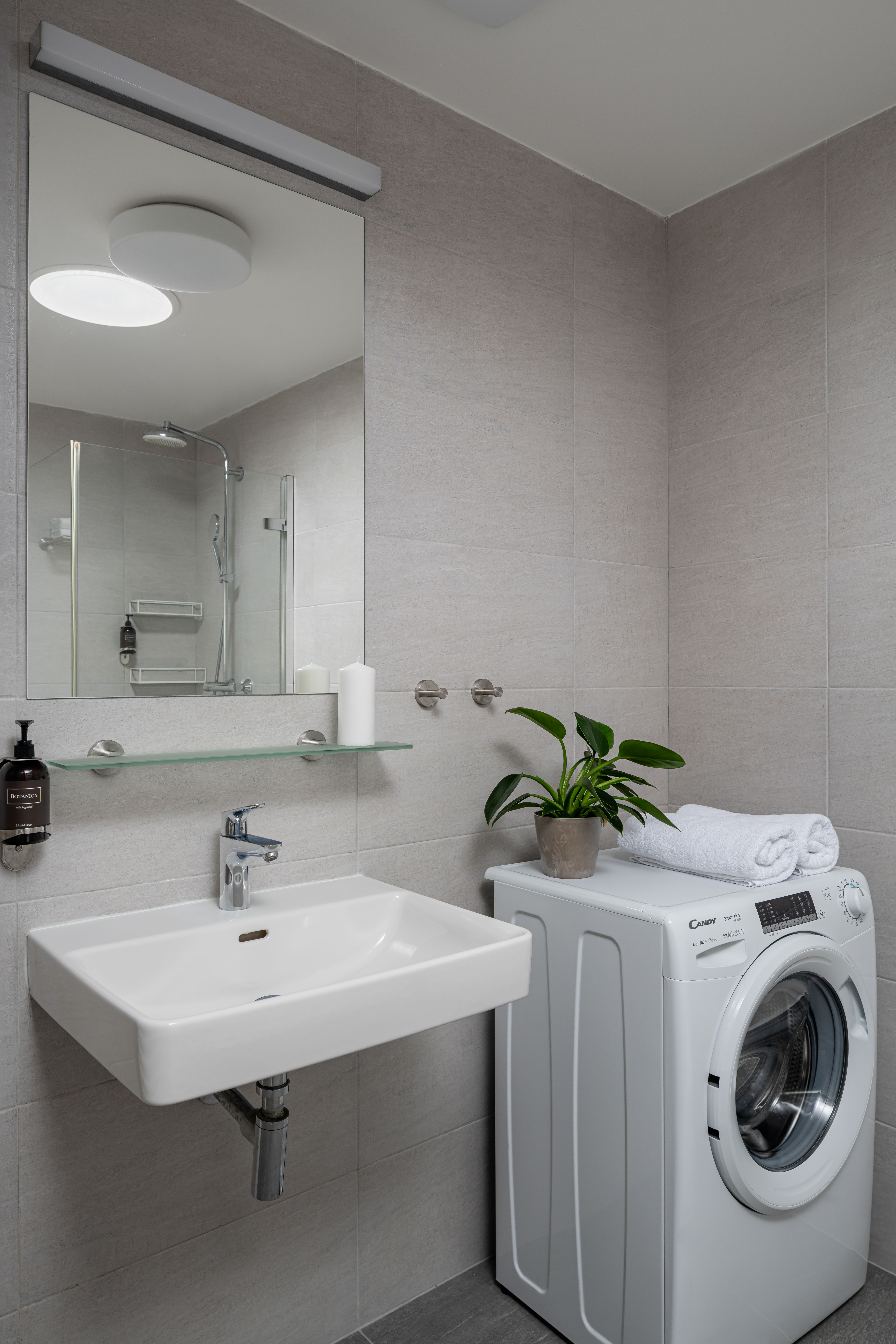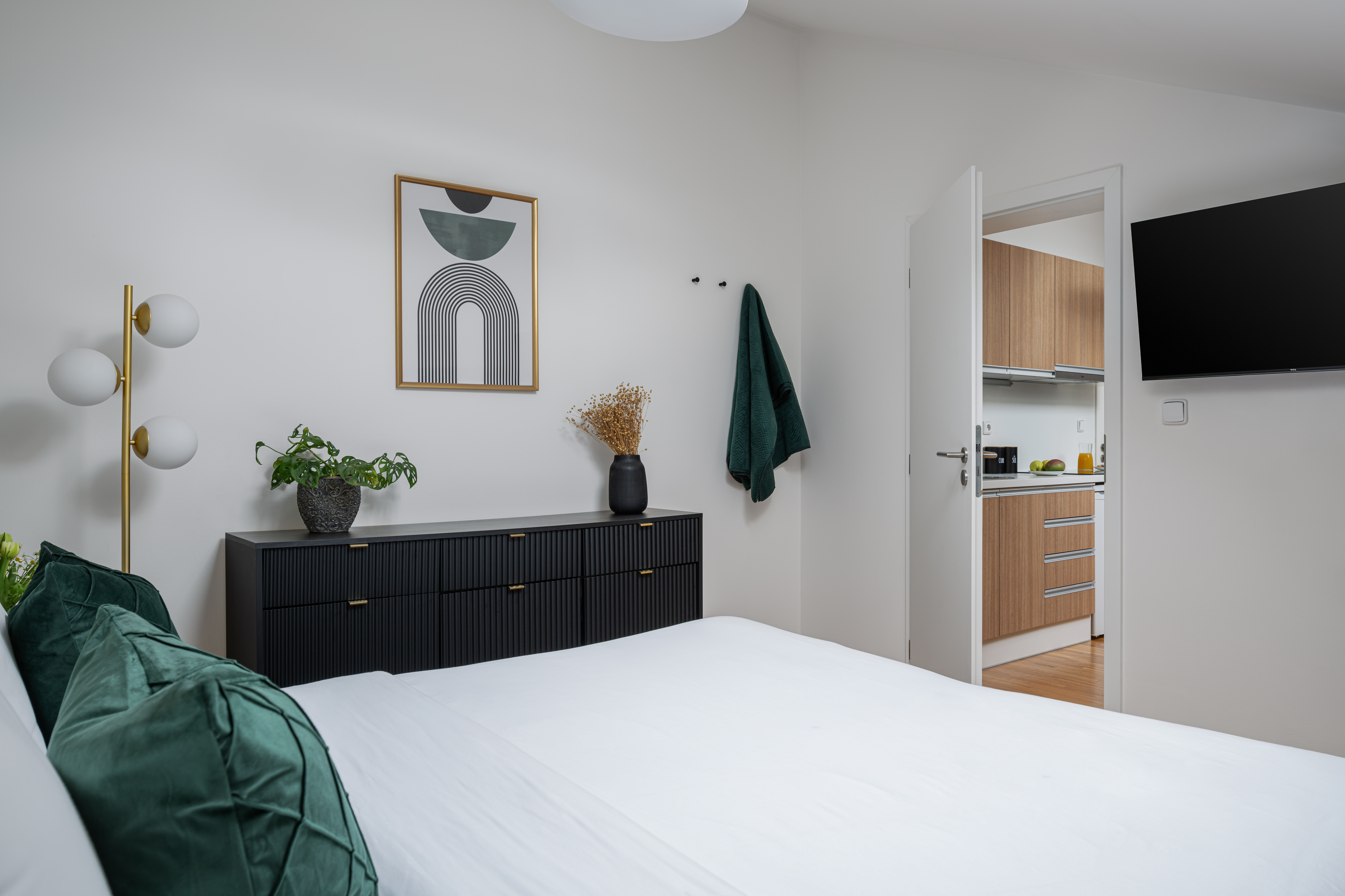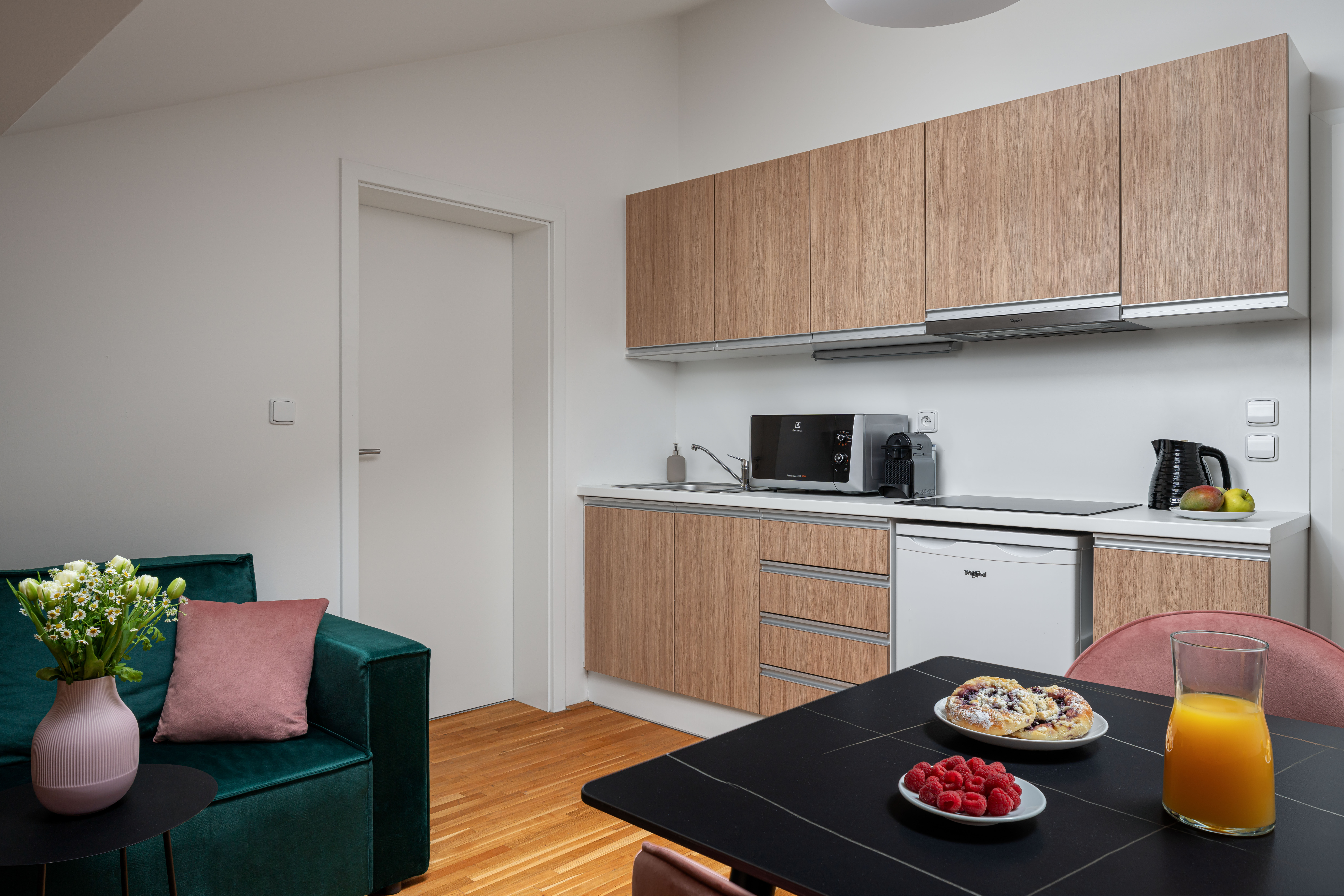The apartment features a separate bedroom with a comfortable double bed, offering a quiet space for a restful night’s sleep. Two additional guests can sleep comfortably on the sofa bed in the living area, which also serves as a cozy place to relax, spend time together, or enjoy a meal at the dining table.